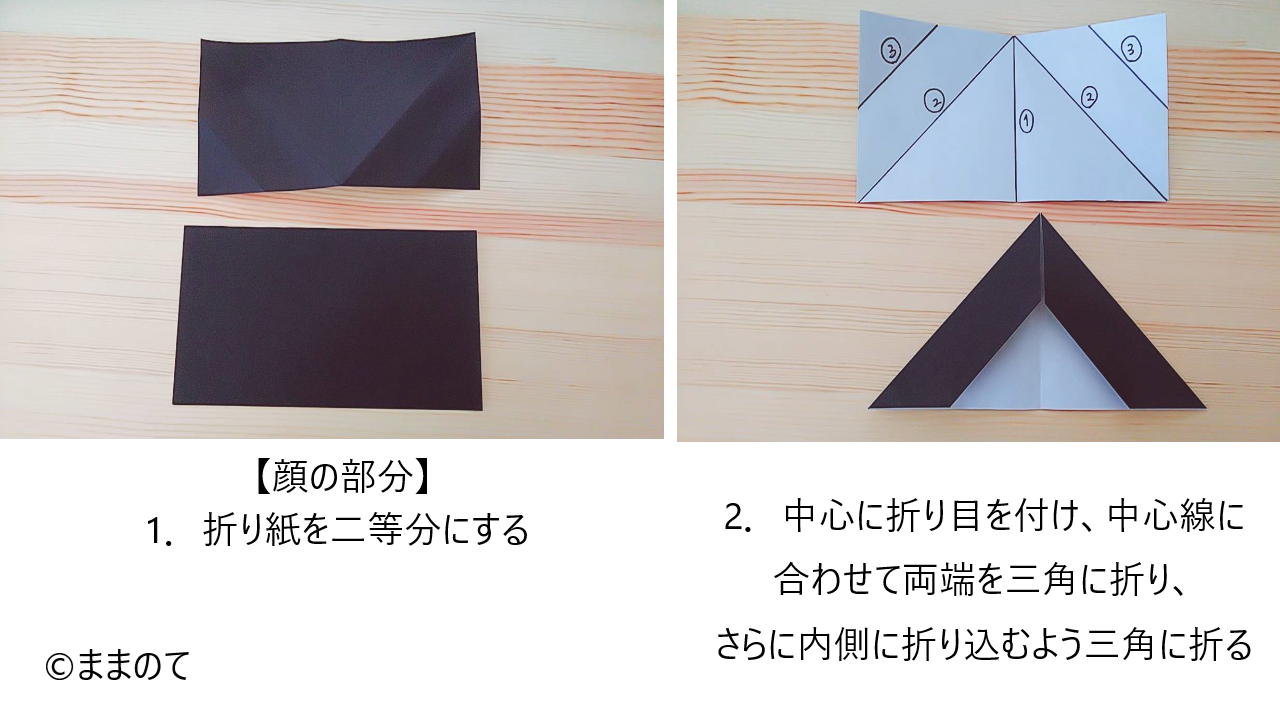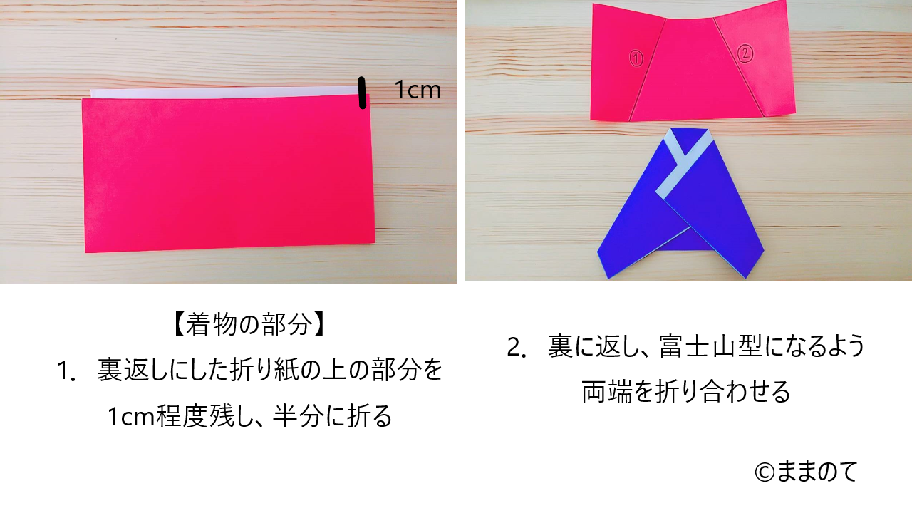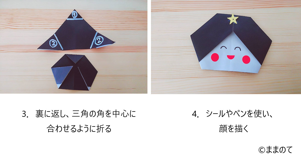 顔と着物の部分をそれぞれ折り、のりやテープで貼り合わせます。子どもが折り紙を折るのが難しければ、顔を描くだけでも立派な製作になりますよ。