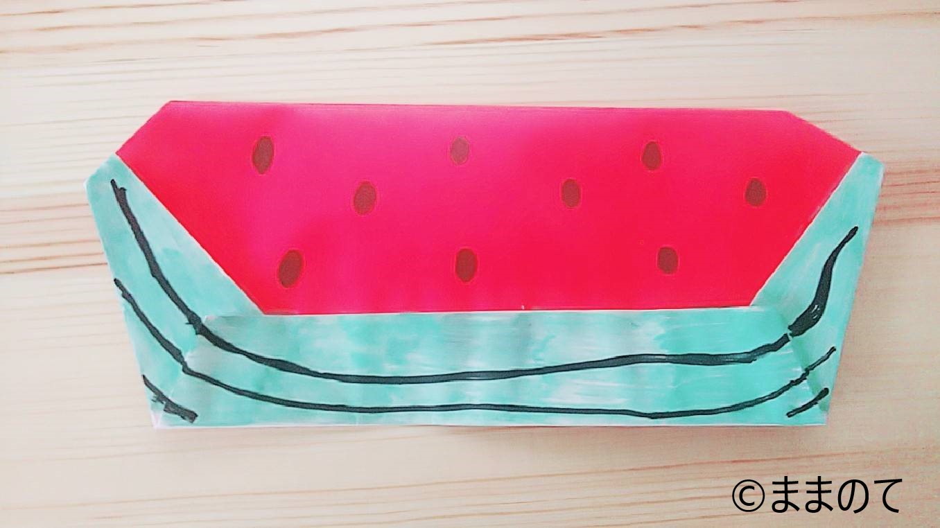 1歳~2歳の子どもは、はさみやのりを使わずに作れる簡単な折り紙製作がおすすめです。「すいか」は、折り紙の端を折るだけで簡単に作ることができます。