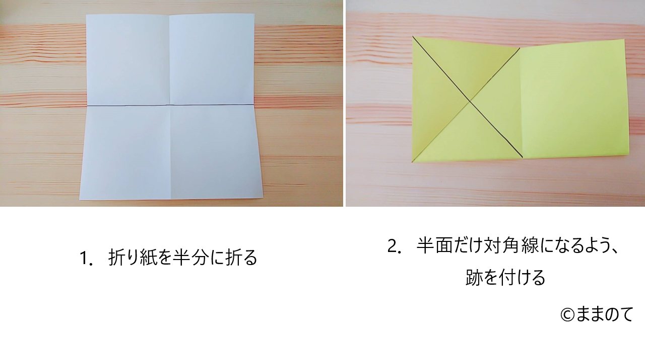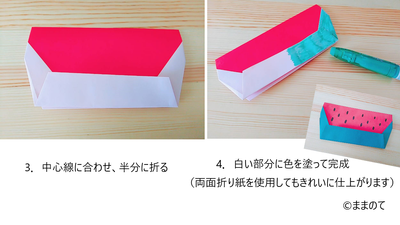 子どもが製作する場合、少し折り目がずれたとしてもそのままやらせてあげましょう。子どもの年齢によって色を塗るのが難しい場合、両面折り紙を使用してはいかがでしょうか。