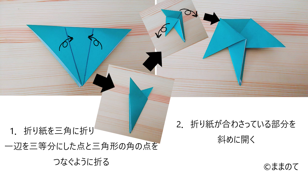 2.折り紙が合わさっている部分を斜めに開くように折る