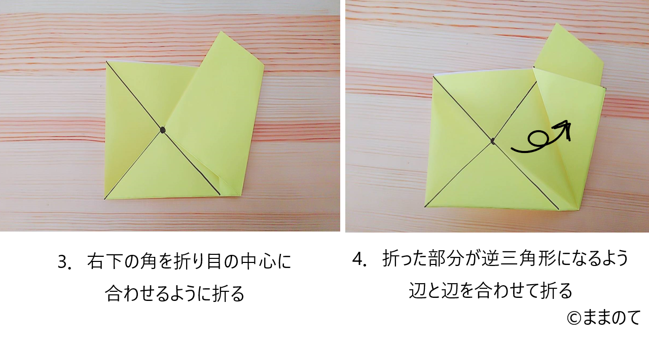 4.折った部分が逆三角形になるよう、辺と辺を合わせて折る