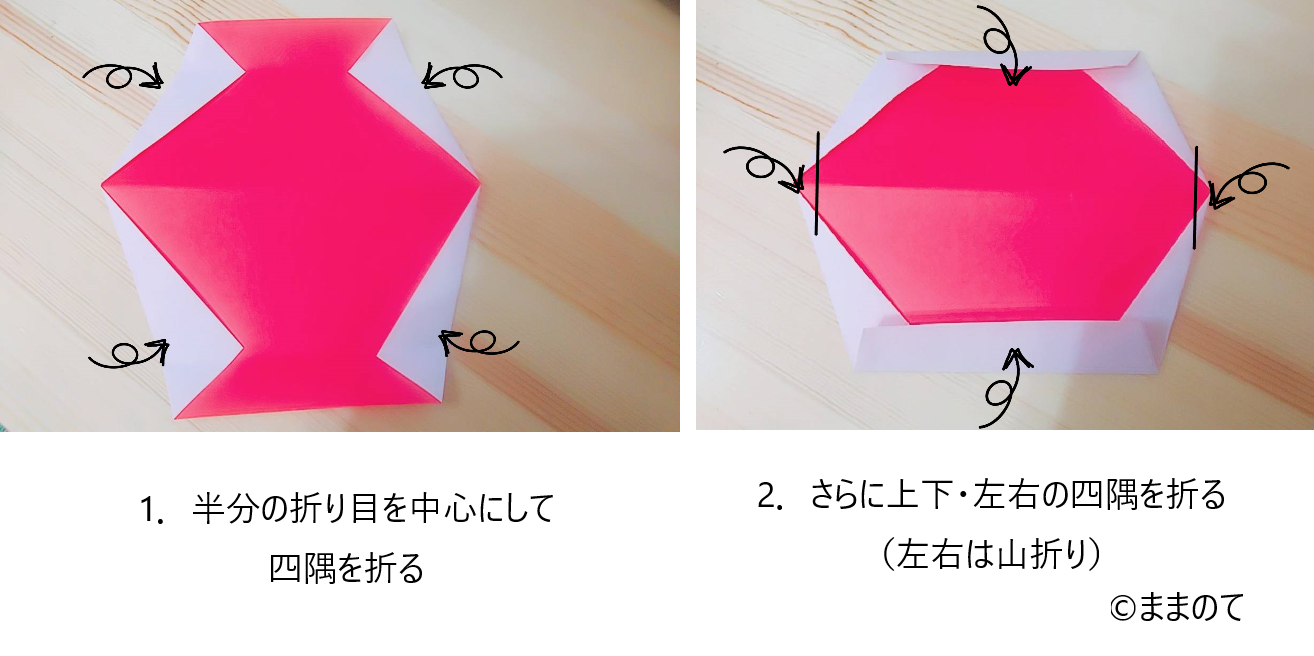 2.さらに上下・左右の四隅を折る(左右は山折り)