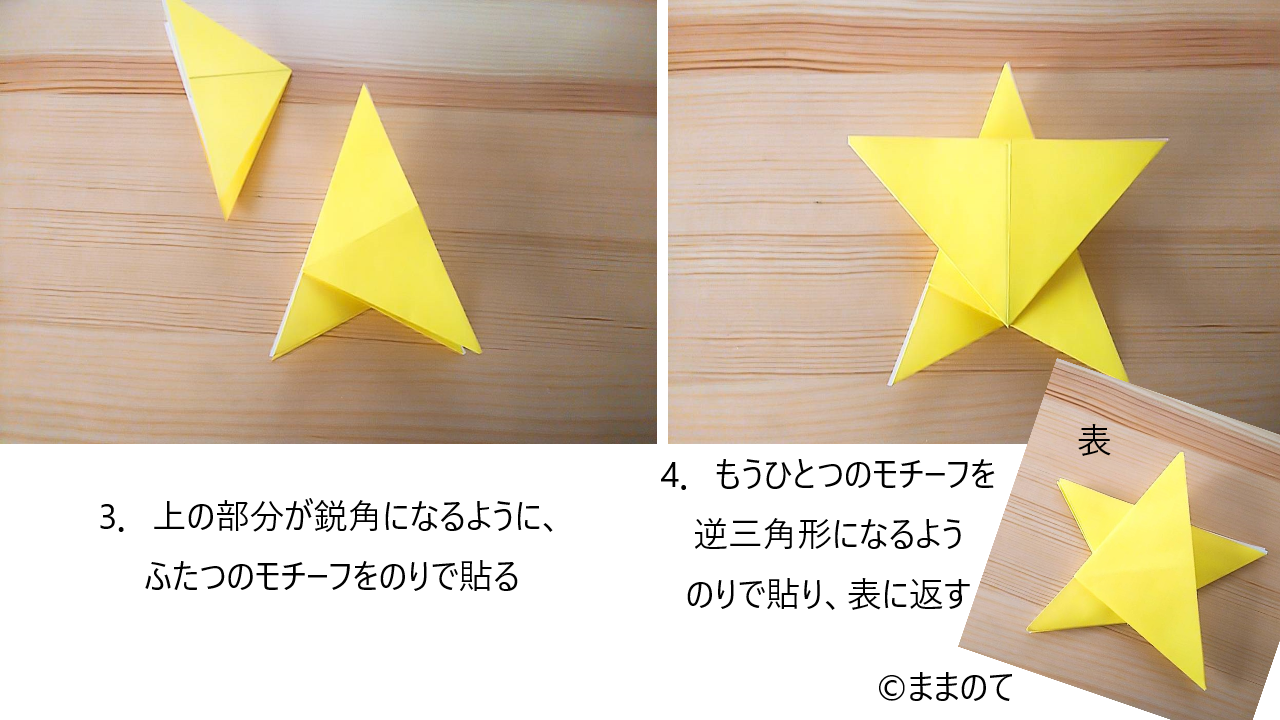 3.上の部分が鋭角になるように、ふたつのモチーフをのりで貼る