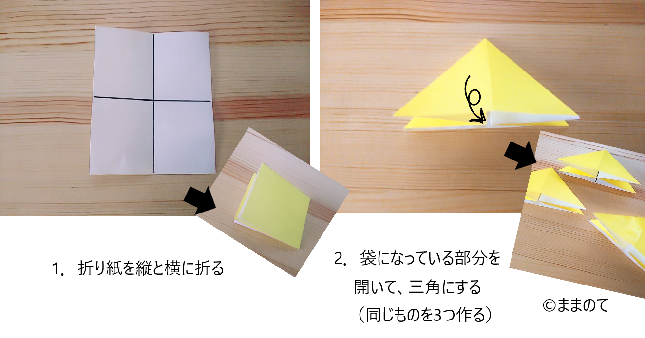 2.袋になっている部分を開いて、三角にする(同じものを3つ作る)