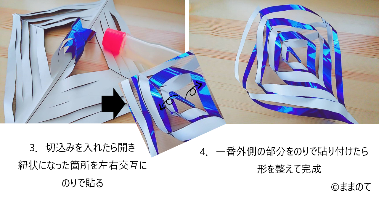 3.切り込みを入れたら開き、紐状になった部分を左右交互にのりで貼る