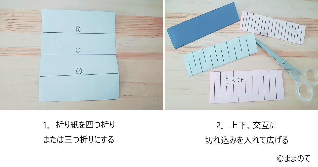 はさみを上手く使って折り紙に切り込みを入れれば、天の川が作れます。折り紙の他、色紙を使ってもきれいに仕上がりますよ。
