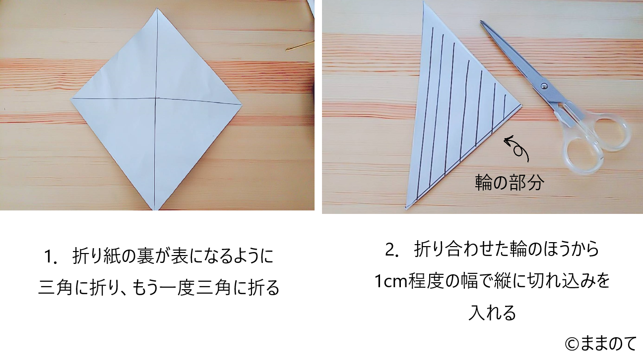 1.折り紙の裏が表になるように三角に折り、もう一度三角に折る
