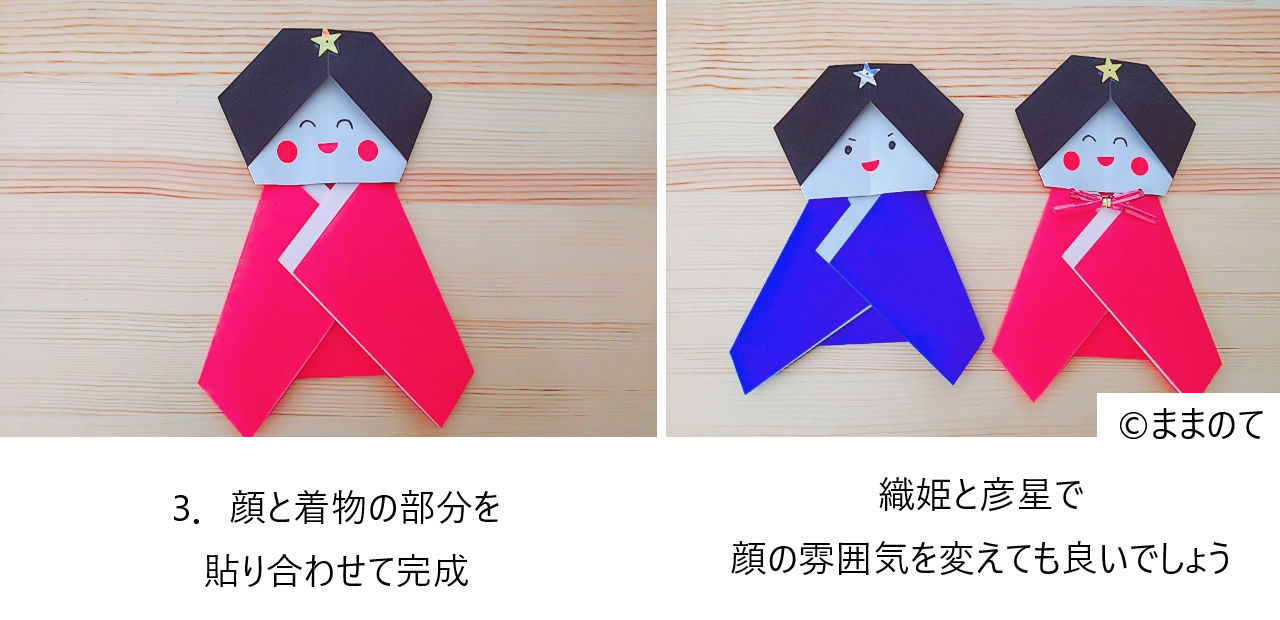 折り紙や和紙で「織姫と彦星」を作ることができます。いろいろな表情と着物を組み合わせ、バリエーション豊かな織姫と彦星を作ってみてくださいね。