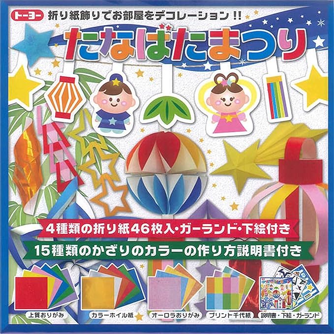「たなばたおりがみ」は、織姫と彦星、短冊や星といった七夕のモチーフを一式作ることができます。つなぎ飾りや鞠飾りの作り方も紹介されているため、一風変わった七夕飾りにチャレンジしたい方も参考にしてみてください。