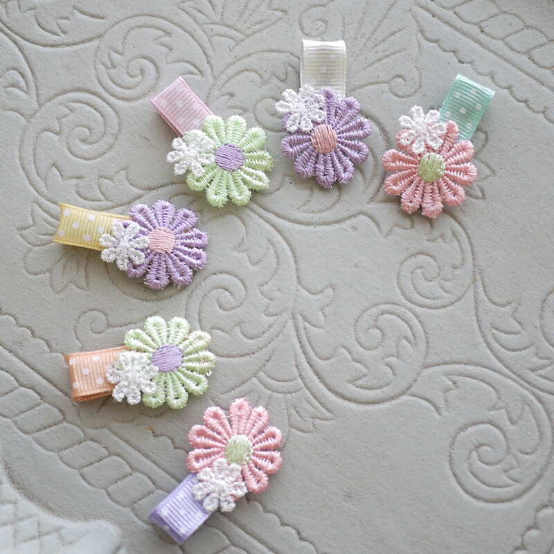 小ぶりなデイジーレースヘアクリップをあしらったかわいらしいヘアクリップです。淡いマカロンカラーのお花とクリップを包むリボンの組み合わせで、6種類のデザインがそろいました。洋服とも合わせやすく、赤ちゃんのおしゃれが楽しめます。