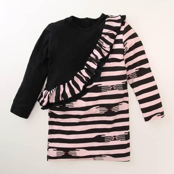 こちらはデンマークの子ども服ブランド「フィクソーニ」の、デニムドレスとボディスーツのセットです。北欧らしいカラフルなボーダーと、裾のフリルがとてもかわいいですね。