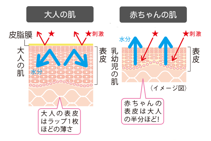 大人の肌は表皮と皮脂膜によって外からの刺激から守られていますが、生まれたばかりの赤ちゃんの表皮は大人の半分くらいの厚さしかありません。水分も油分も大人に比べてずっと少ないのが特徴です。そのため赤ちゃんの肌は刺激に弱く、すぐに乾燥してしまいます。