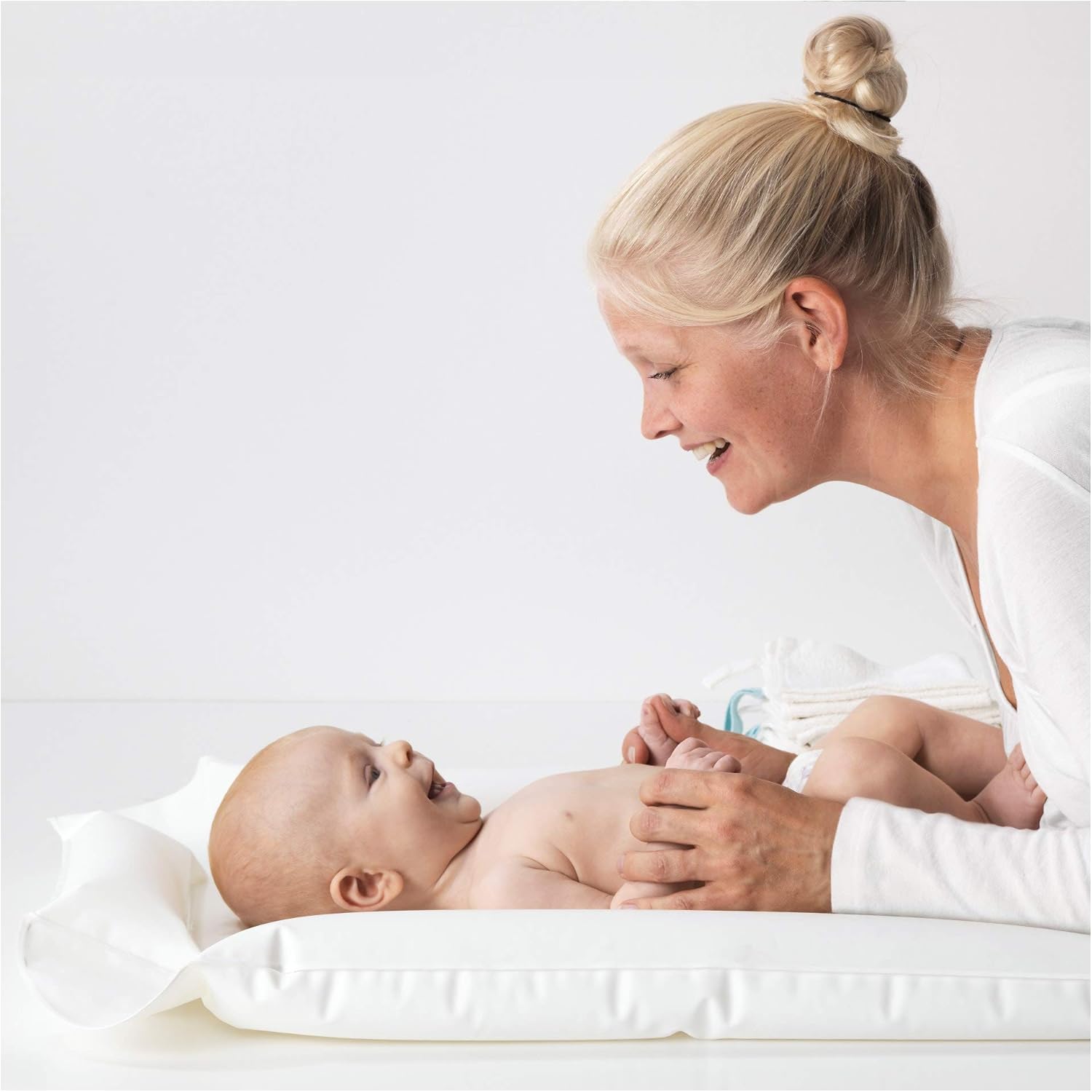 四辺に空気でふくらませて使うソフトビニール製なので汚れに強く、お風呂上りのケアマットとしても使えます。バスタオルなどをかけて使うと、赤ちゃんがより快適に過ごせます。
