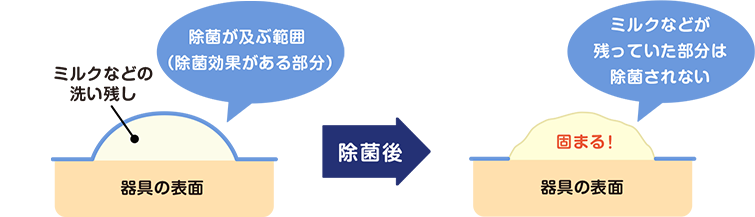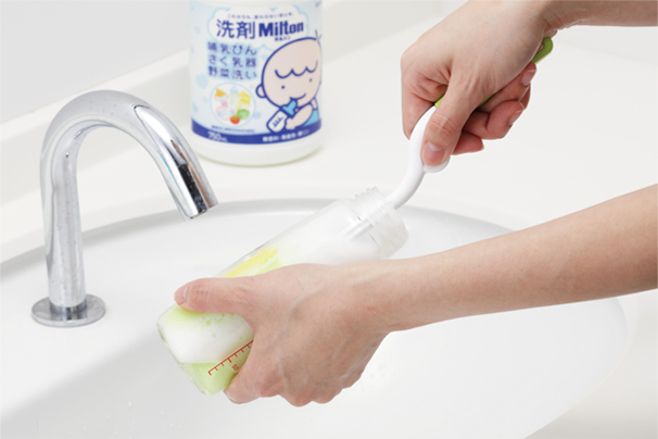 使った哺乳びんには、ミルクやよだれなどのタンパク汚れが付いています。こうしたタンパク汚れが残っていると、十分な除菌効果が得られません。そのため、除菌の前のステップとして、タンパク汚れをしっかりと洗い流しておくことが大切です。