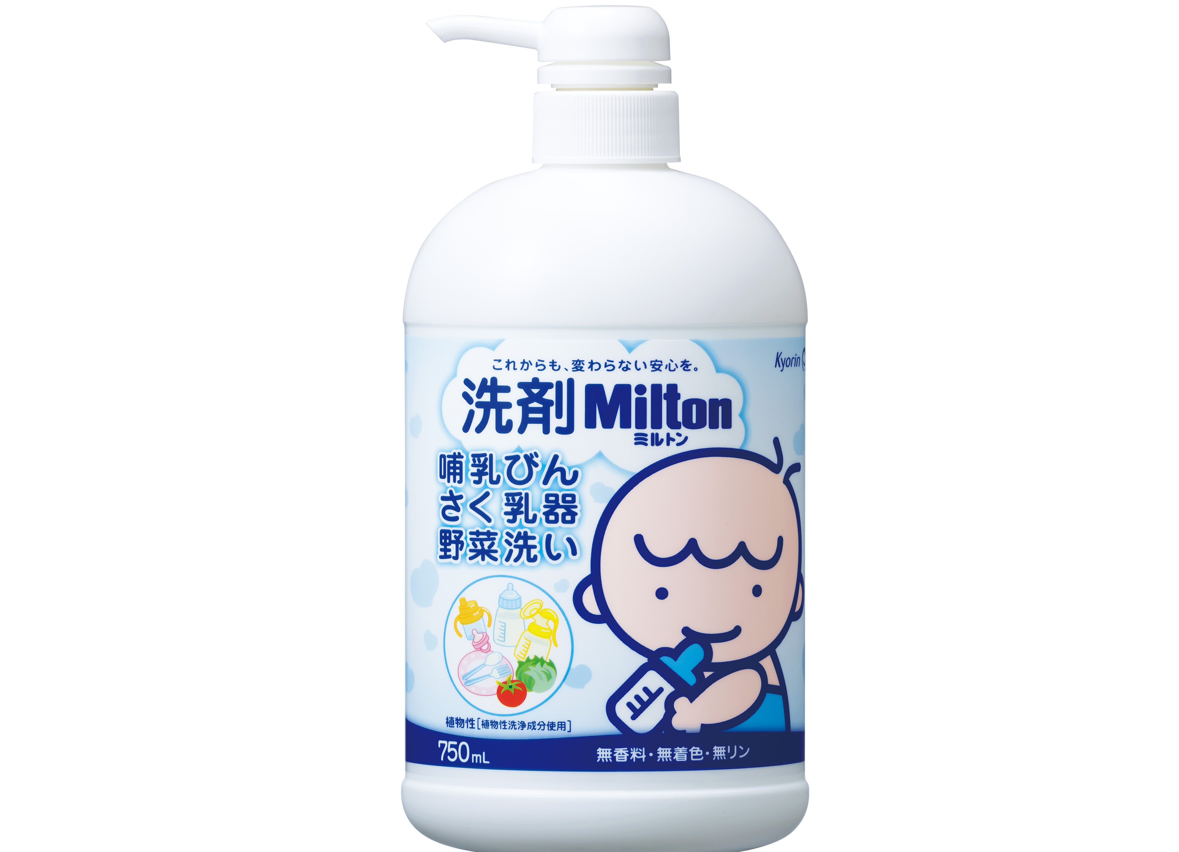 洗剤は大人と同じものよりも、ベビーグッズ用の洗剤を使うと安心です。多くのママに愛用されている「洗剤Milton哺乳びん・さく乳器・野菜洗い」は、植物性洗浄成分を使用した、無香料・無着色・無リンのやさしい成分で作られた洗剤です。哺乳びんやおしゃぶりなど、赤ちゃんの口に直接触れるベビーグッズにおすすめですよ。