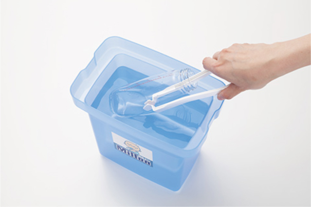 溶液を調製したら、よく洗ったベビーグッズを溶液に浸します。哺乳びんの内側や乳首の吸い穴に気泡が入らないようにしっかりと沈めましょう。そのまま1時間つけておくだけで、除菌は完了です。