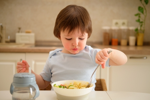 2歳頃になると、フォークやスプーンに慣れるころです。メニューによっては、お食事エプロンがなくても上手に食べられる子どももいます。2歳頃はまだ食べムラや好き嫌いがあり、食事を残してしまうことが多いものです。苦手な食べ物をうまく工夫して調理し、少しずつ食べられるようにしてあげましょう。