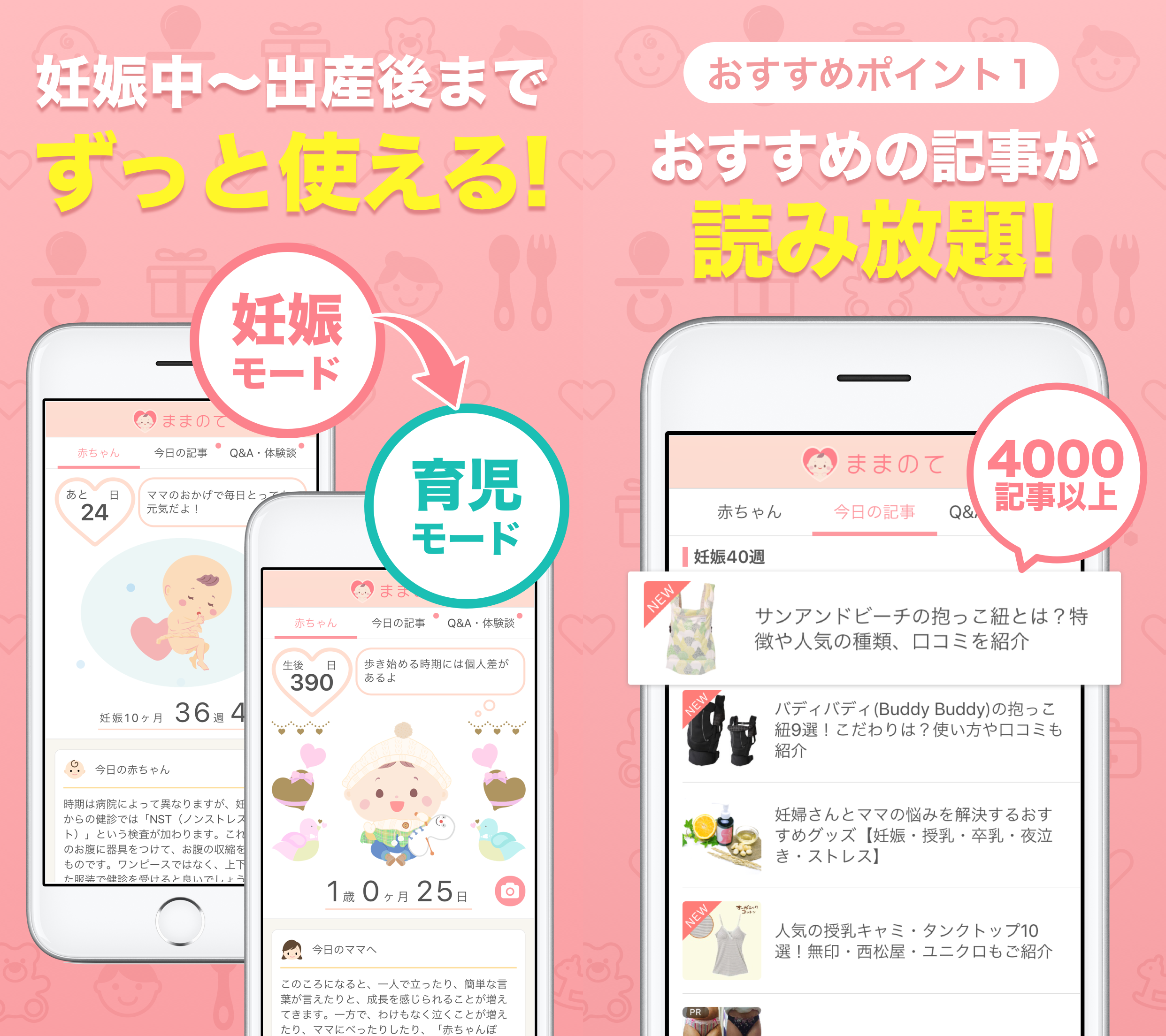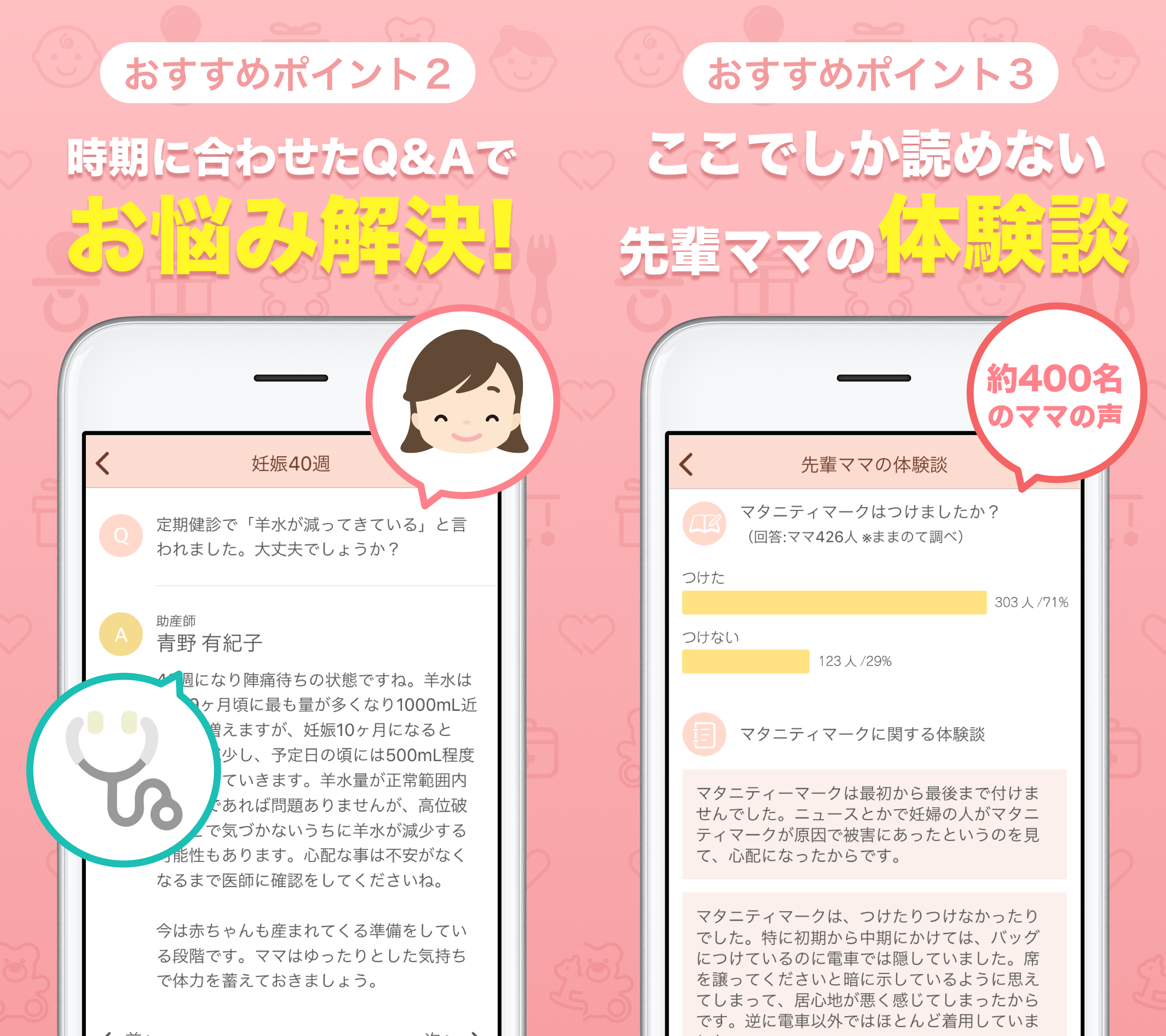 助産師・小児科医によって監修されたQ&A、約400人の先輩ママへのアンケート結果や豊富な体験談など、育児中のママが気になる内容がいつでも読み放題です。