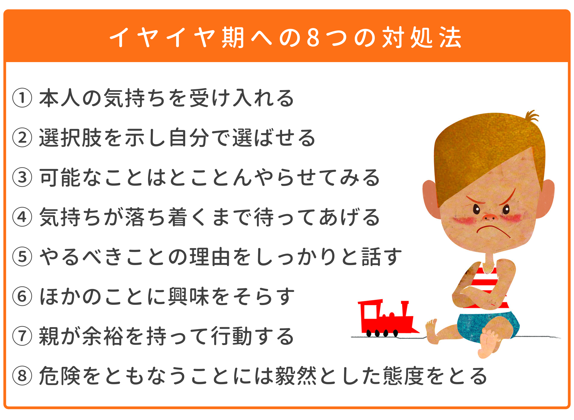イヤイヤ期の子どもには、本人の気持ちを受け入れ、可能なことは自分で選ばせたりやらせたりしてあげることが有効です。ただし、危険が伴うことには毅然とした態度で対応しましょう。