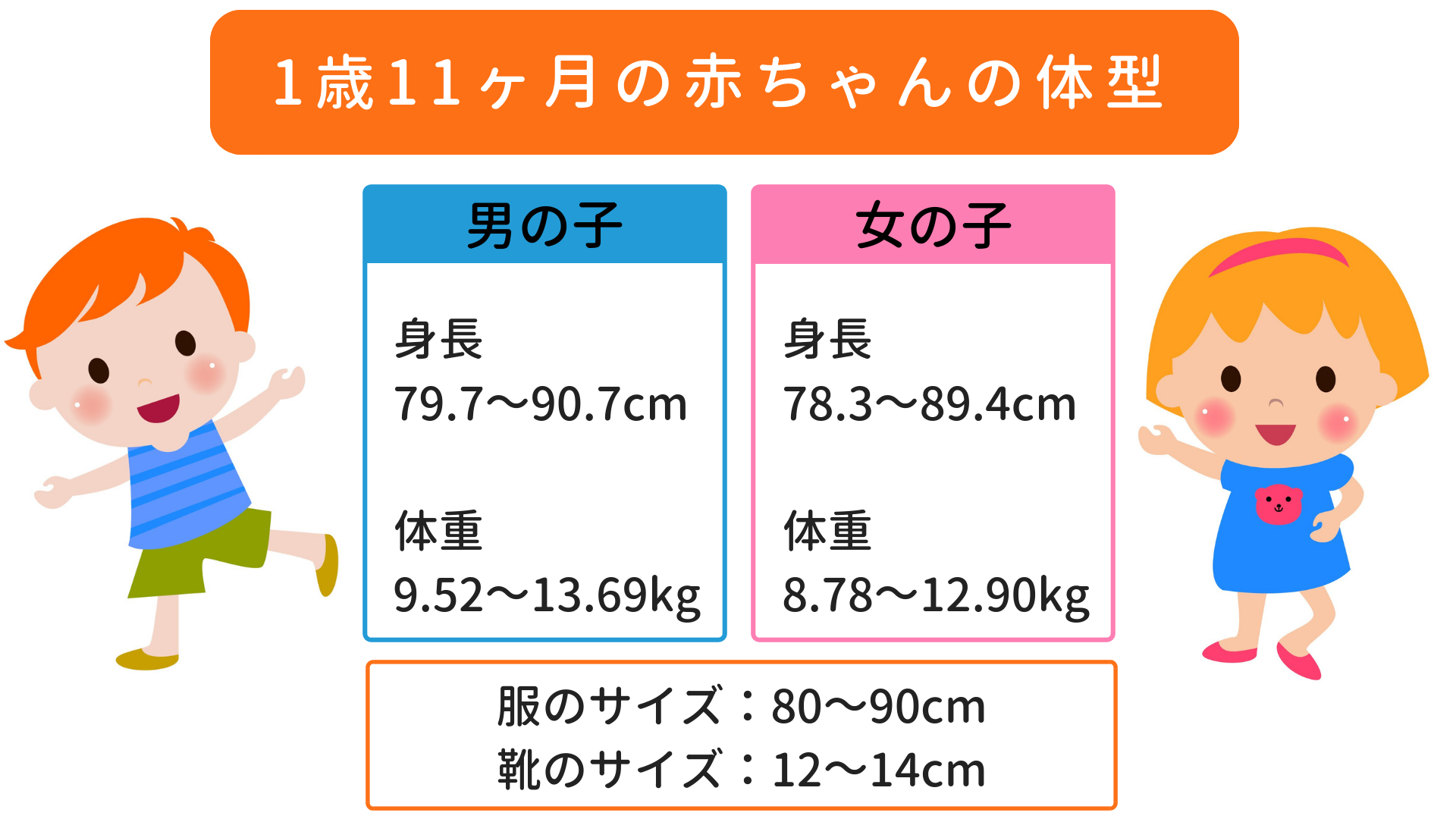 1歳11ヶ月頃の赤ちゃんの服のサイズは80~90cm、靴のサイズは12~14cmが目安です。ただしこちらはあくまで参考程度に考え、赤ちゃんの成長に合ったサイズの服や靴を選ぶようにしましょう。