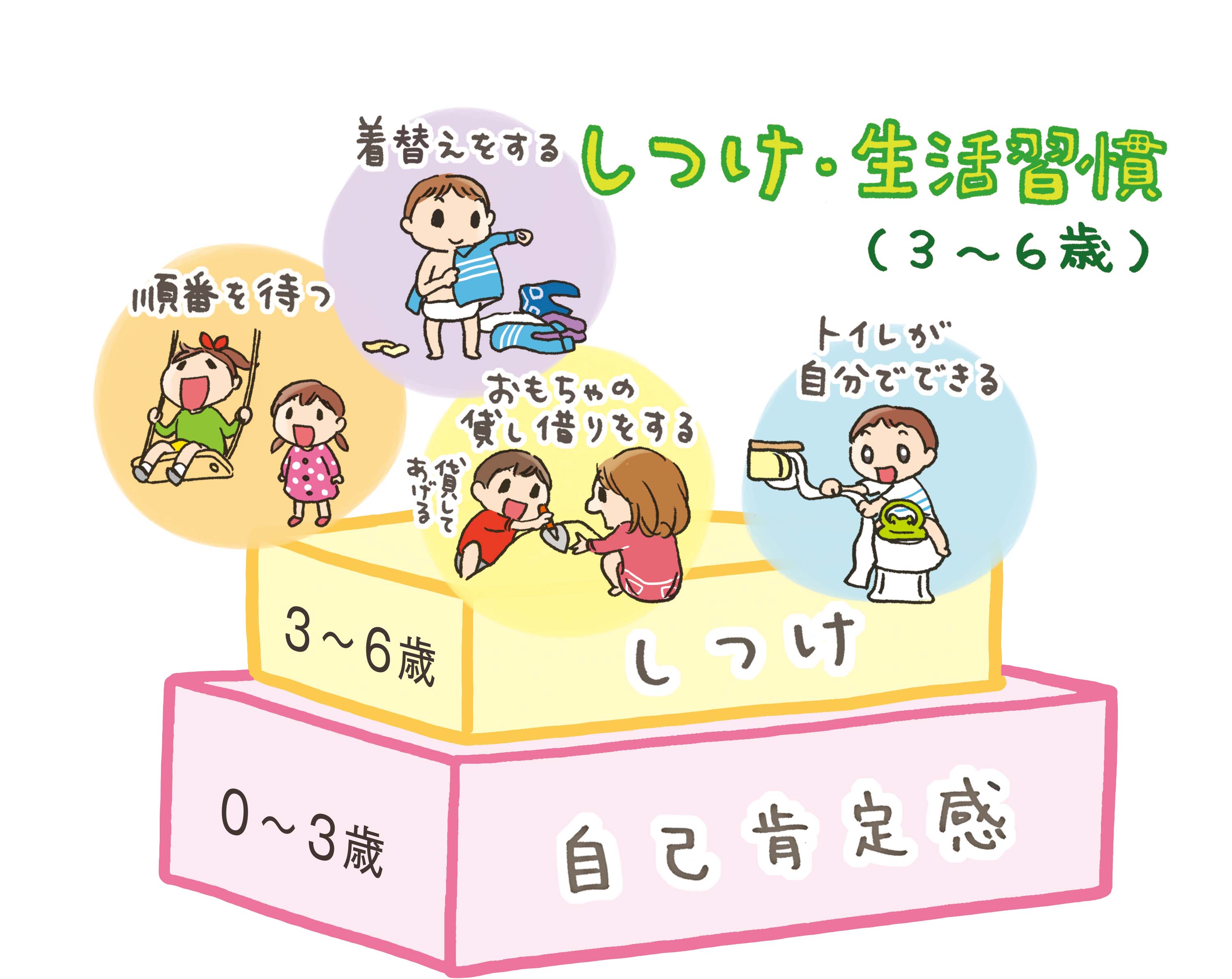 自己肯定感がしっかりと育まれた子どもは、生活習慣を身につけたり、親にしつけられたことを守ったりすることができます。生活習慣や基本的な行儀作法は3~6歳頃に身につけられると考えられます。