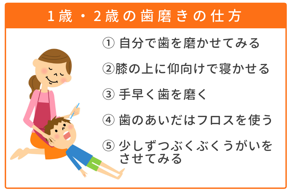 最初は子どもに歯ブラシを持たせて自分で磨かせます。子どもに歯磨きを習慣付けるためなので、歯ブラシを噛むなど、上手に歯磨きできなくても問題ありません。仕上げ磨きはママやパパが膝の上に寝かせて行います。奥歯にはフロスを使うと歯間の汚れもきれいに落ちますよ。2歳頃からはうがいの練習も始めてみましょう。