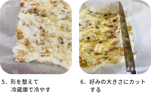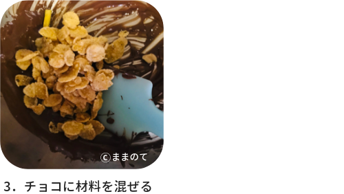 4.3にホワイトチョコ、コーンフレークなどの残りの材料をすべて入れ、素早く混ぜる