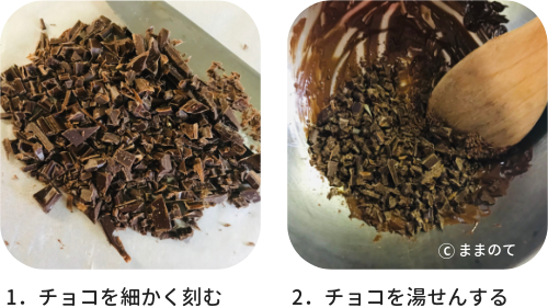 チョコレートを溶かすときは50~55℃のお湯で湯せんします。高温のお湯で湯せんするとチョコレートの風味が損なわれるので、温度をしっかり測ってから湯せんしてくださいね。お湯の量が多すぎたり慌てて混ぜたりすると、チョコレートにお湯や蒸気が入ってしまうので注意しましょう。