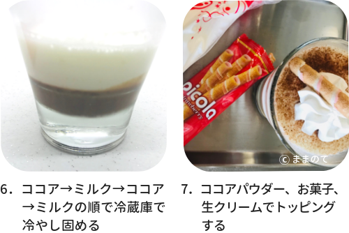・トッピング用生クリーム・お菓子・ココアパウダー適量