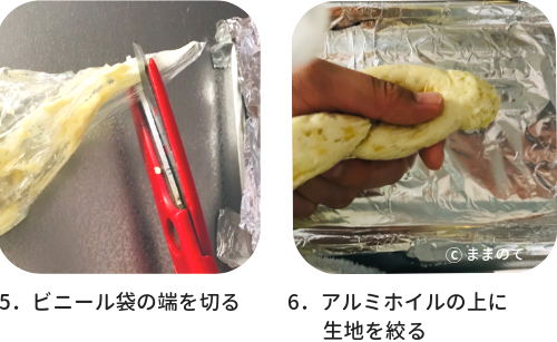 6.天板に敷いたアルミホイルの上に生地を絞る