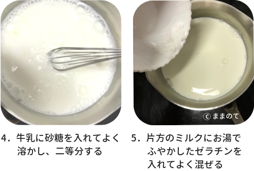 2)ゼラチンの1/4をお湯でふやかし、一方の牛乳に入れてよく混ぜる