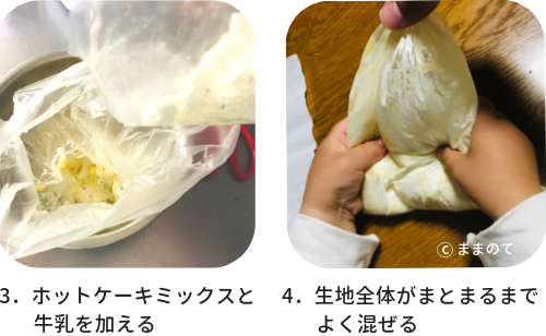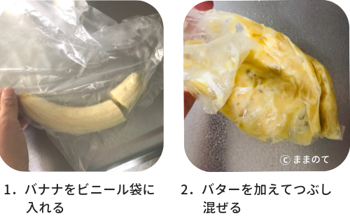 2.ビニールの上からバナナを手でつぶし、室温に戻したバターを加えよく混ぜ合わせる