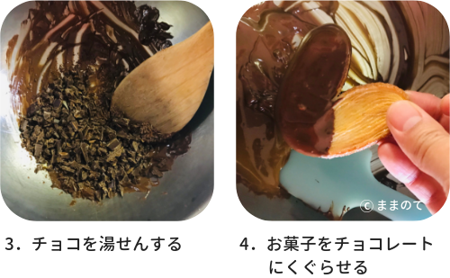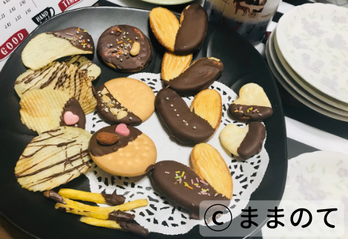 湯せんしたチョコレートに好みのお菓子をディップするだけの簡単メニューです。ビスケットやポテトチップスなど、さまざまなお菓子で試してみてくださいね。コーティングしたチョコレートをチョコスプレーやナッツでデコレ―ションしてもかわいいですよ。