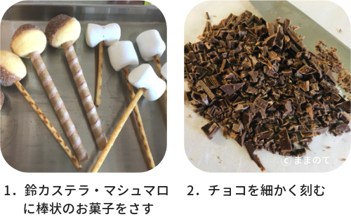 1.鈴カステラとマシュマロに棒状のお菓子をさす
