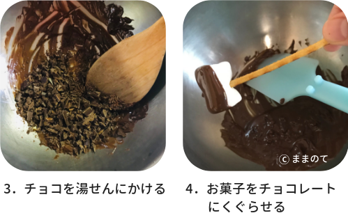 4.お菓子をひとつずつチョコレートにくぐらせる