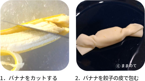 2.餃子の皮にバナナをのせ、キャンディ型に包む
