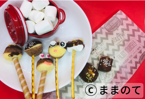 鈴カステラとマシュマロで作るロリポップです。チョコフォンデュのようにみんなでディップすれば、きっと盛り上がりますよ。プレゼントにもぴったりです。