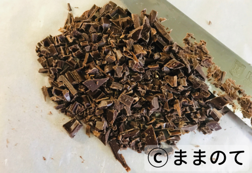 細かく砕いたチョコレートは溶けやすいので、手で触らないようにしましょう。チョコレートを素早くボウルに移せるように、折り曲げられるやわらかいまな板を使うか、まな板の上にキッチンペーパーを敷いておくと便利です。