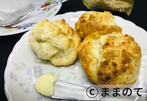 やさしい甘さと香ばしさがポイントのスコーンです。ホットケーキミックスとビニール袋を使えば15分程度で作れます。洗い物が少ないので、ママにも嬉しいレシピですよ。