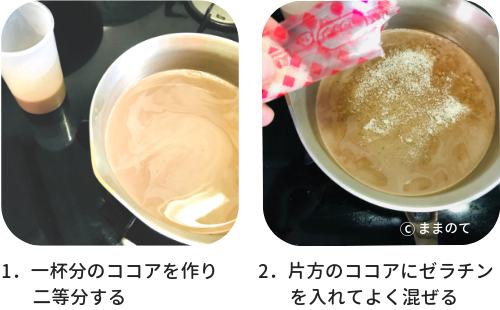 2)ゼラチンの1/4をお湯でふやかし、一方のココアに入れてよく混ぜる