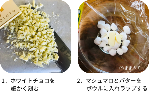 2.マシュマロとバターをボウルに入れ、ふんわりとラップをかける
