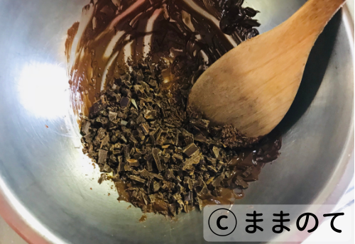 チョコレートは、5mm程度の大きさで均一に刻むのがポイントです。チョコレートの大きさにばらつきがあると、溶け方にムラが出てしまったり、溶ける時間がかかってチョコレートの風味が損なわれたりします。