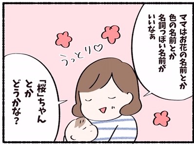 私は「桃ちゃん」とか名詞が付く名前に憧れていたので、日本らしい「桜」という名前を推薦。しかし夫は、代々の家の名前と合わせた名前が良いという考えでなかなかかみ合わず。