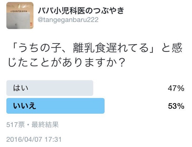 私が以前、Twitterのアンケート機能で集めたデータによると、およそ半数くらいの方が離乳食の進み具合に悩んでいました。正確な統計ではありませんが、離乳食が進まないと悩むパパ・ママは決して少なくはないと考えます。