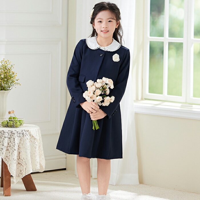 フォーマルな場にふさわしい白とネイビーでまとめたワンピースです。刺繍入りの大きな丸襟がアクセントとなり、かわいらしくも上品にも着こなせそうです。生地には伸縮性があり、子どもが違和感なく動けるので、発表会や結婚式などでも重宝しますよ。