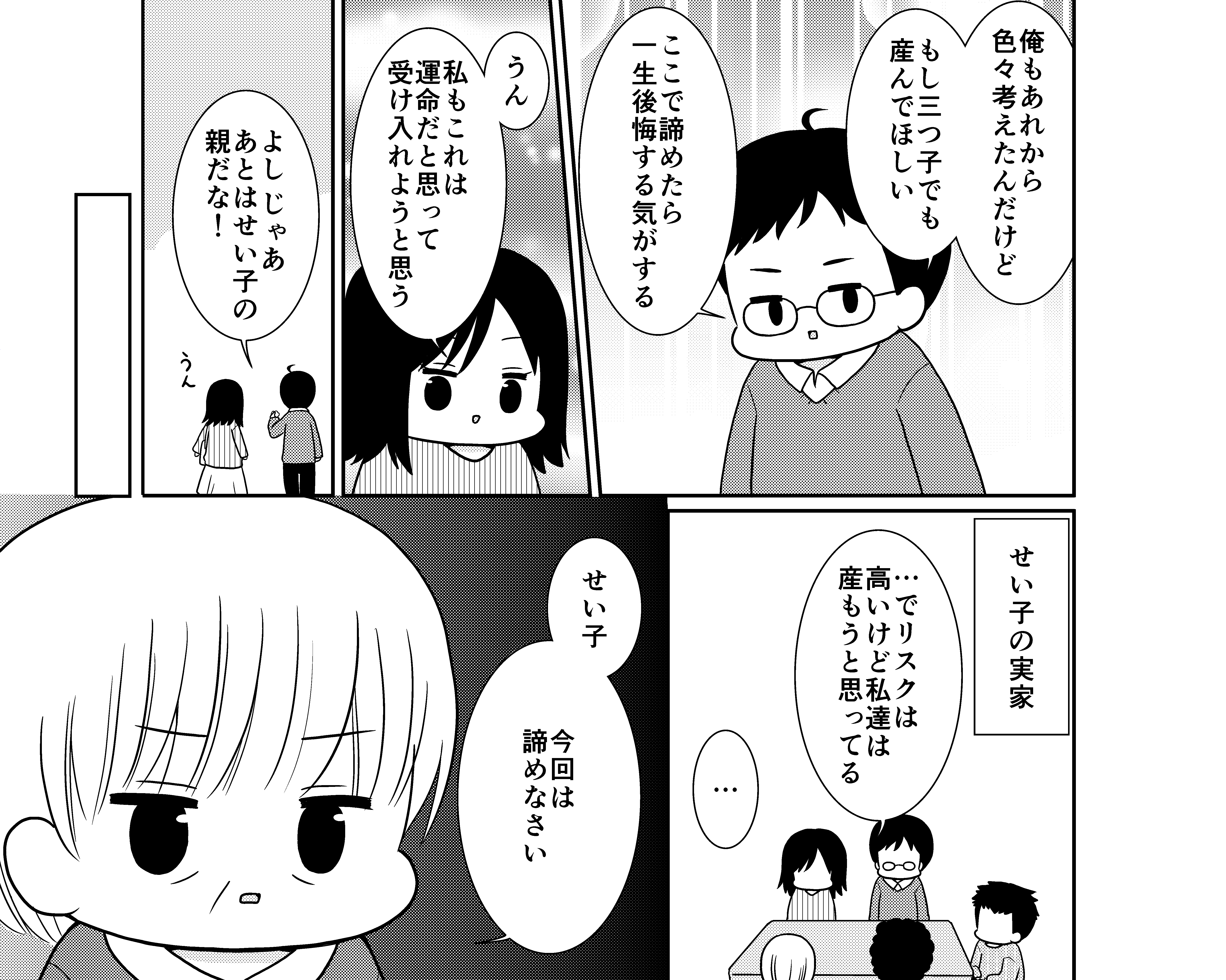 しかし、1980年代のほうが今より医療が発達しておらず、多胎児の妊娠・出産に関する情報は少なかったかもしれません。出産に臨むせい子さん夫婦はもちろん、まわりの家族も「三つ子妊娠」に不安が募っている様子が描かれています。