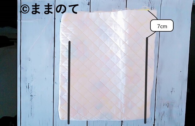 生地を裏返した状態のまま、巾着の入口になる部分を3cm折ります。裁ち目から1cm程度の場所を縫いましょう。