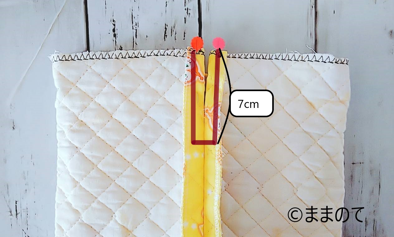 巾着タイプの上履き入れは、紐を2本使用して両手で引っ張るタイプが一般的です。両端のあき口を7cmあけて縫うと良いでしょう。