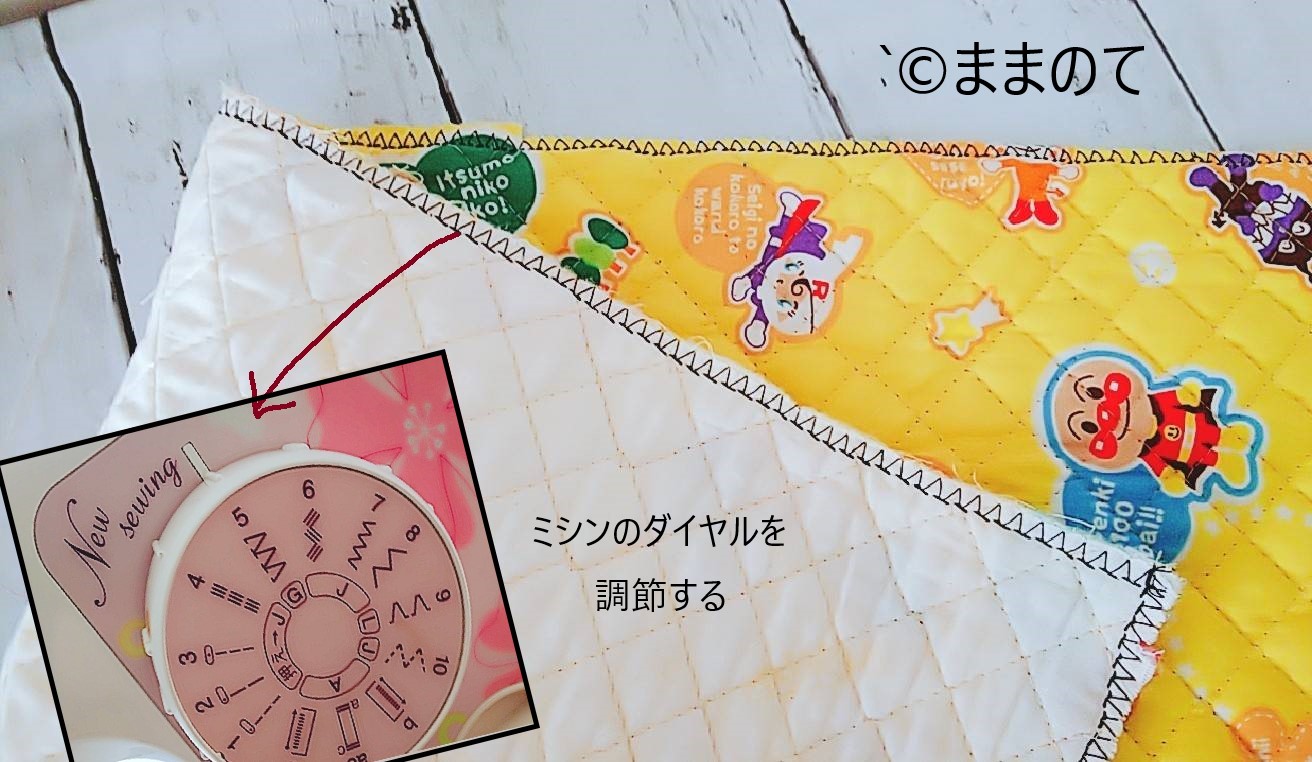 キルティングはじょうぶな布ですが、まずは端がほつれないように縫い代を始末する必要があります。ミシンを使用する場合、縫い代の調節ダイヤルをかがり縫いなどに設定しましょう。