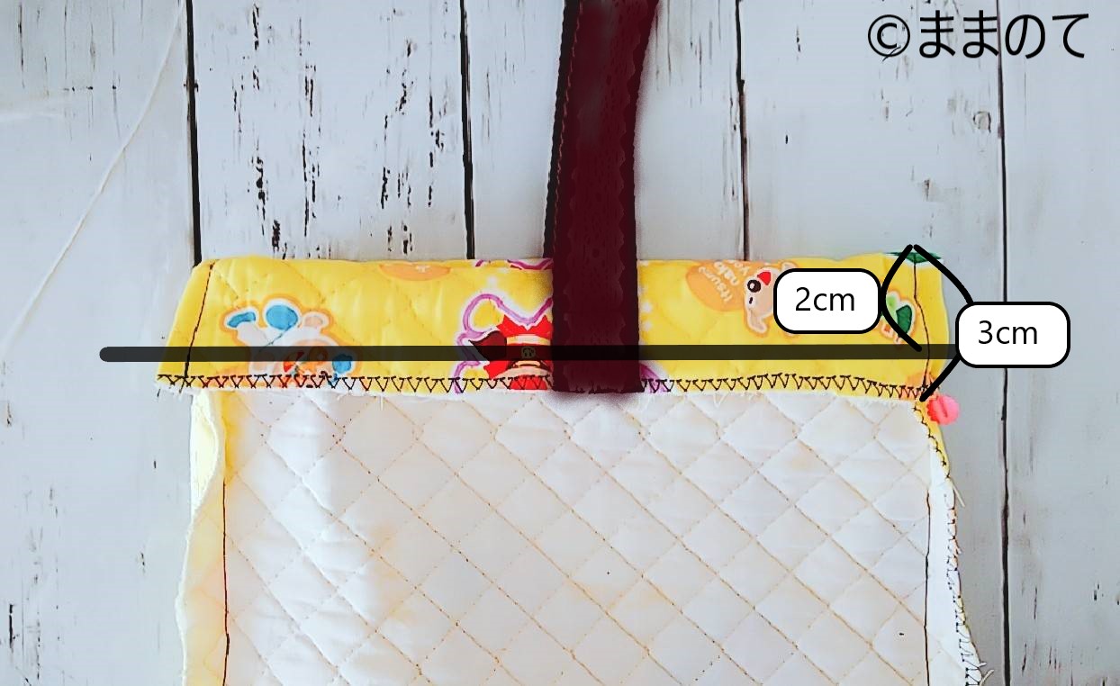 持ち手部分になるアクリルテープを取り付けます。巾着の入り口になる部分に合わせ、2cm程度あいだをあけて縫います。